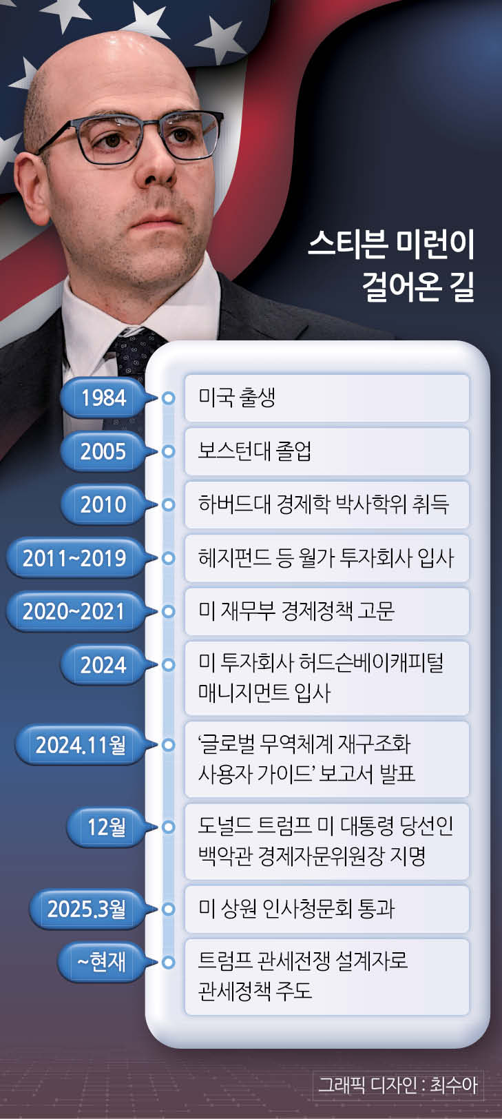 공교롭게도 이런 세계관은 지난해 11월 트럼프 대통령 당선 직후 발표된 ‘글로벌 무역체계 재구조화 사용자 가이드’라는 41쪽짜리 보고서의 근간을 이루고 있다. 이 보고서를 작성한 미국 투자회사 허드슨베이캐피털매니지먼트의 매크로 전략 담당자 스티븐 미런(41)은 한 달 후 트럼프 행정부의 경제정책 자문을 총괄하는 백악관 토토사이트 프리미어토토회(CEA) 위원장으로 지명된다. 이 보고서는 결국 먹혀들었고, 미런 위원장은 불과 41세의 나이에 세계 초강대국의 경제정책을 좌우하는 핵심 공직자로 거듭난 것이다. 트럼프 1기 미 재무부 경제정책 고문에서 트럼프 2기 CEA 위원장으로 ‘퀀텀 점프’에 성공한 그는 소셜미디어 엑스에 “매우 영광스럽다”는 소감을 남겼다. 그러면서 “미국 경제를 인플레이션 없이 빠르게 성장시켜 미국인에게 번영을 안겨줄 대통령의 정책을 위해 일하길 기대한다”고 썼다.
