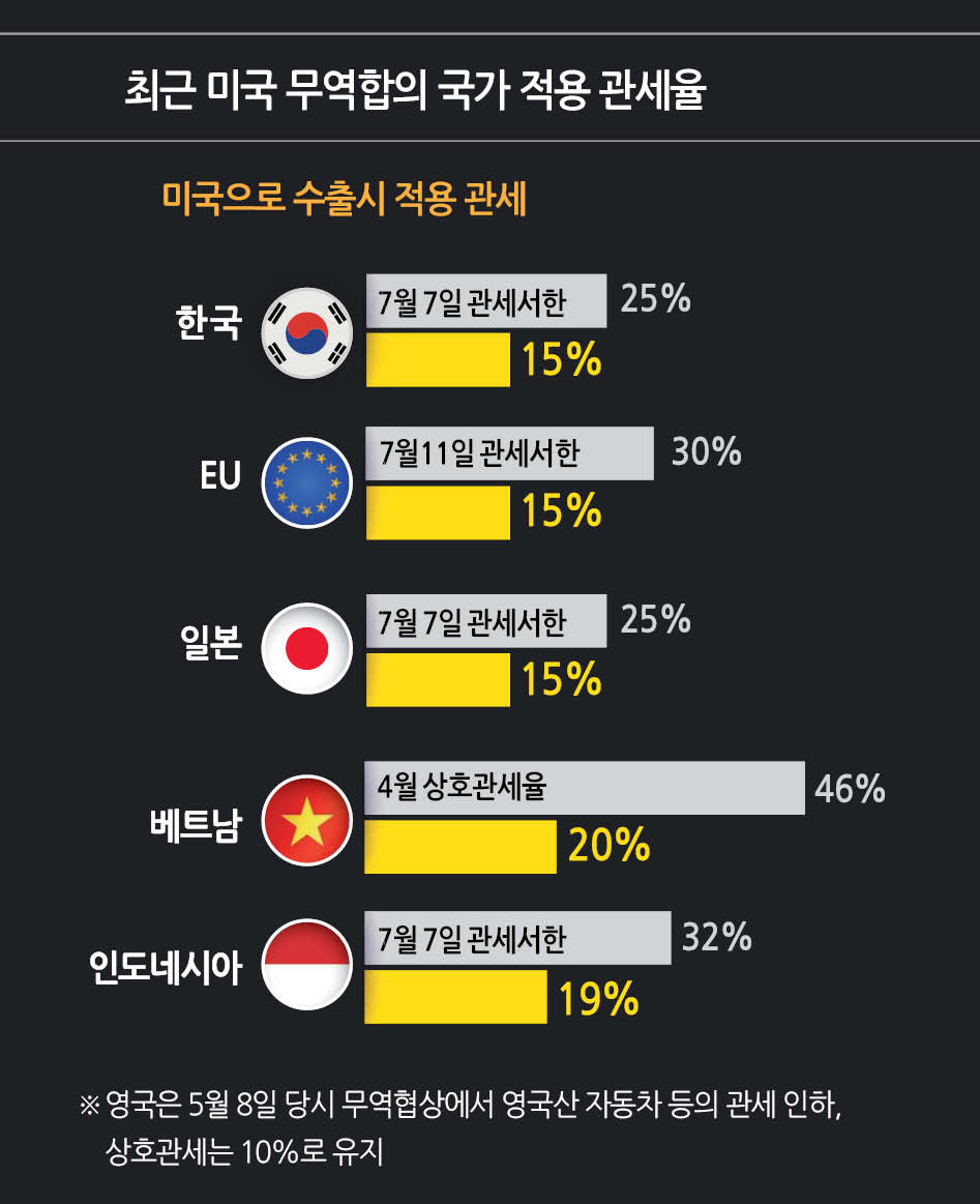 그러면 토토사이트 프리미어토토 전쟁은 어디까지 왔을까. 미국은 트럼프 대통령 취임 후 6개월간 한국(토토사이트 프리미어토토율 15%)을 비롯해 영국(10%), 인도네시아(19%), 베트남(20%), 필리핀(19%), 일본(15%), EU(15%) 등 7개국과 토토사이트 프리미어토토 협상을 타결했다. 철강·알루미늄 등에는 별도의 품목토토사이트 프리미어토토 50%를 붙였고, 2주 내 의약품 토토사이트 프리미어토토를 발표한다.