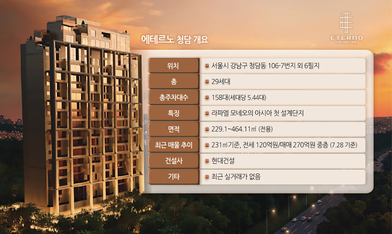 최근에는 손흥민 선수가 400억원에 그랜드 디럭스 펜트하우스를 분양받은 것으로 알려져 이목을 끌고 있다. 에테르노압구정 또한 총 29가구 규모로, 오는 2028년 준공 예정이다. 에테르노토토사이트 토실장보다 1.6배 가량 크며 옛 효성빌라 부지에 위치한다.