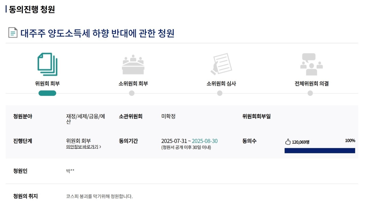 4일 가상 스포츠토토업계에 따르면 이날 오전 10시 58분 기준 국회 국민동의청원 게시판에 등록된 ‘대주주 양도소득세 기준 하향 반대 청원’의 동의 인원은 12만69명에 달했다. 전날 오후 7시에 10만명을 넘긴 데 이어 단시간 내 빠르게 확산했다. 해당 청원은 지난달 31일 게시된 지 하루 만에 5만 명의 동의를 얻었고, 현재 국회 정식 접수 요건을 충족해 상임위원회로 이송될 예정이다.