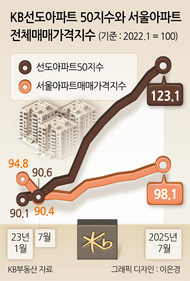 5일 KB호날두 토토사이트에 따르면 시가총액 상위 50개 아파트의 가격 변동률을 보여주는 ‘KB선도아파트 50지수’는 지난달 123.126(2022.1=100)로 역대 최고치를 찍었다. 전고점인 2022년6월(101.4) 대비 21.4% 늘어난 것이다. 이에 반해 서울아파트 매매가격지수는 98.1로 전고점(100.6, 2022년6월) 대비 감소했다.