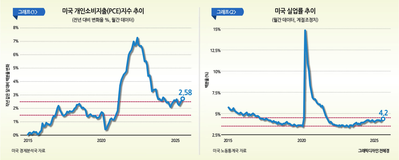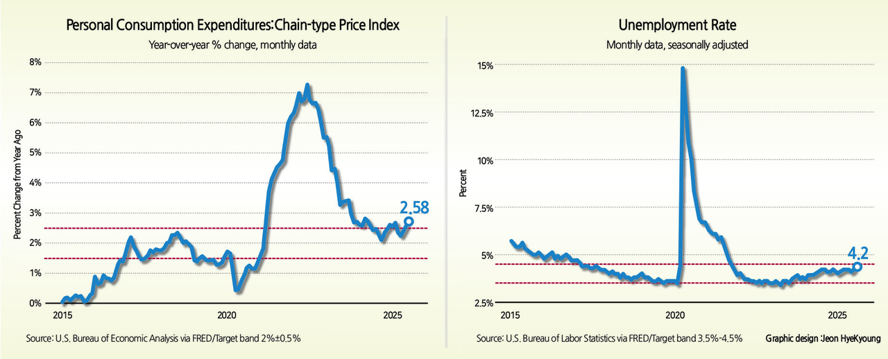 ‘최대 고용’이란 인플레이션을 유발하지 않는 범위 내에서 가능한 최고 수준의 고용을 의미한다. 연준은 특정 실업률을 목표로 하지 않으며, 대신 다양한 노동시장 지표를 종합적으로 분석해 고용이 산업 및 지역 전반에 걸쳐 고르게 확산되고 있는지를 본다. ‘물가 안정’이란 인플레이션이 낮고 예측 가능하게 유지돼 가계와 기업이 계획, 투자, 대출, 차입 등을 신뢰를 갖고 할 수 있게 만드는 것을 뜻한다. 연준은 이를 연간 개인소비지출(PCE) 물가지수 기준 2% 인플레이션을 장기 목표로 해석하며 단기 충격을 고려한 점진적 달성을 지향한다. 정책 결정은 연방공개시장위원회(FOMC)가 맡으며 총 19명 중 12명이 투표권을 갖는다. ▷대통령 지명 후 상원 인준을 받은 이사 7명 ▷12개 지역 연준 총재 중 5명 (뉴욕 연준 총재는 상시 투표권 보유, 나머지는 순환) 등이다.