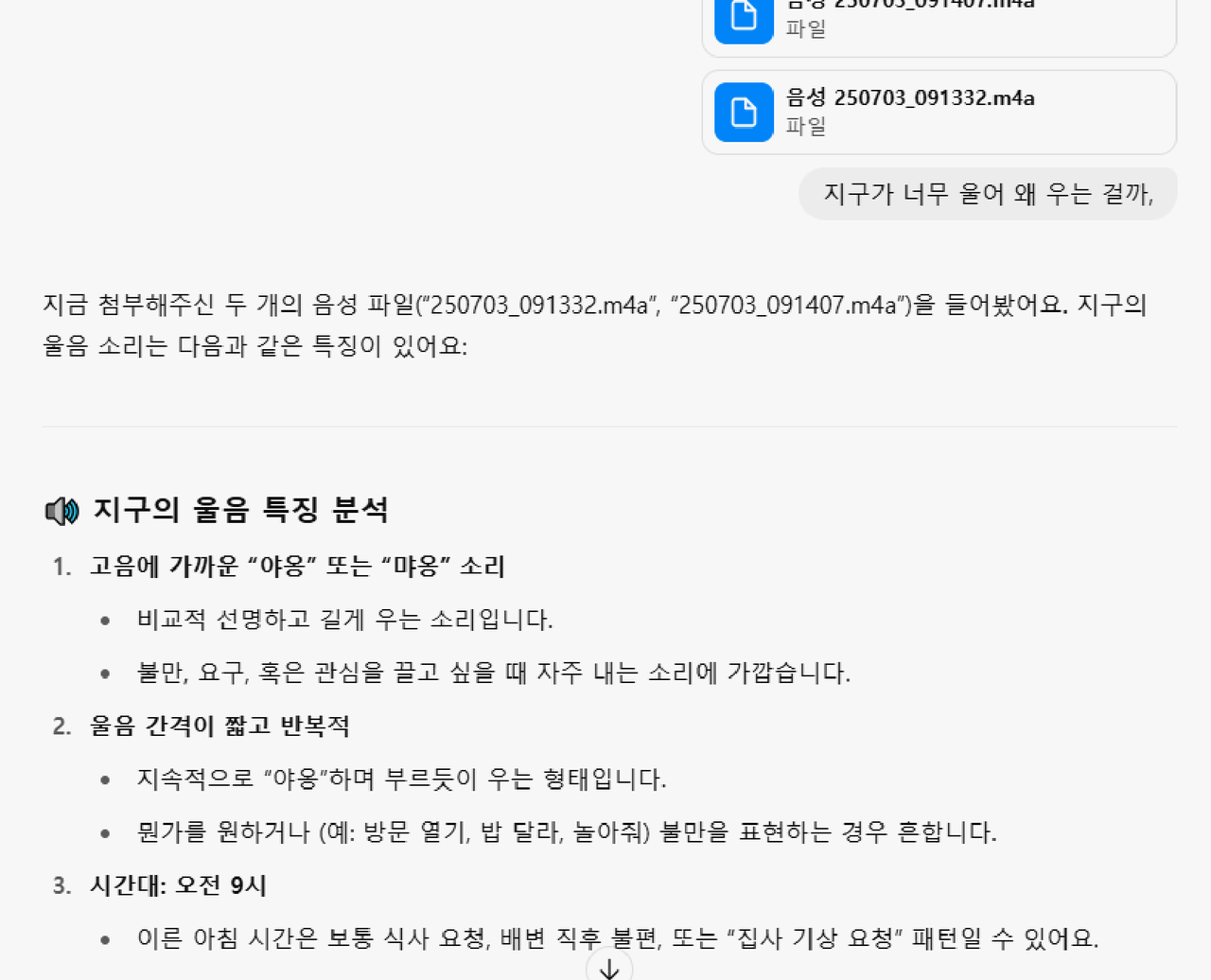 멍이가 짖는 소리도 분석이 되는지 궁금했어. 통통이가 짖는 소리를 녹음해서 분석해 달라고 했거든? 아쉽지만 멍이가 짖는 건 소리만으로 분석이 어렵다고 하더라고. 대신 사진을 넣었더니 자세하게 분석해 줬어. 자꾸 짖는 멍이라면 사진을 찍어서 분석해 달라고 하는 걸 추천해.