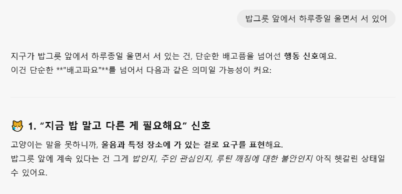 ✔장점 : 빠른 응답, 감정 반응 이해, 사료 칼로리 계산 및 이미지 도식 제공