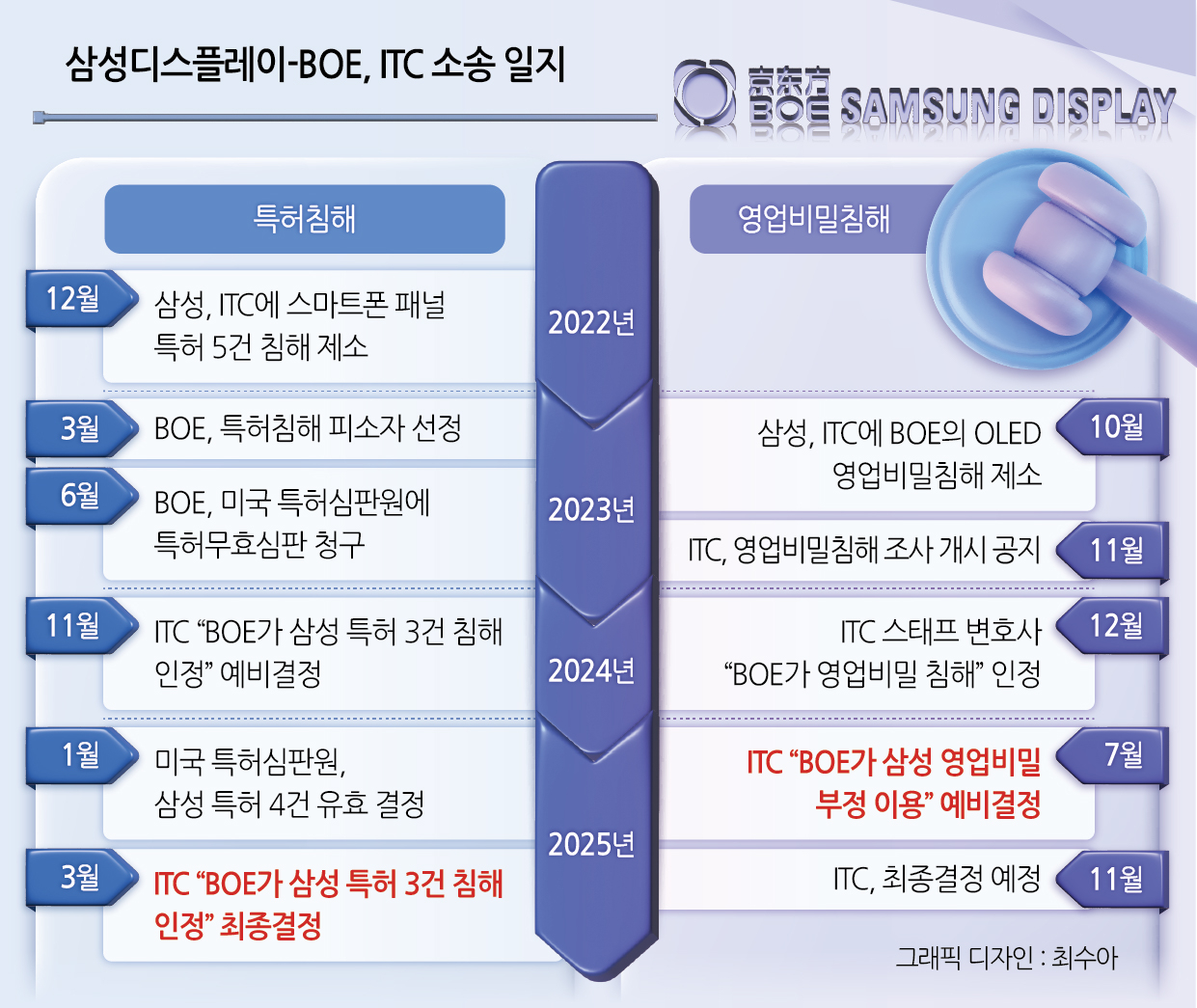 미국 국제무역위원회(ITC)는 지난 7월 예비결정을 통해 중국 BOE 및 7개 자회사가 삼성디스플사이다토토의 OLED 영업비밀을 침해했다고 인정하면서 14년 8개월 동안 BOE의 OLED 패널을 미국으로 수입하지 못하도록 했다.