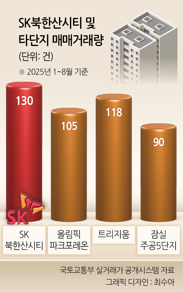 이 같은 입지적 특성을 지닌 SK북한산시티는 신혼부부, 학부모 수요자들을 중심으로 선호도가 높아 올해 들어 100건 이상 거래됐다. 지난 12일 기준 아파트 매매가 130건으로, 1만2032가구 규모 강동구 둔촌동 ‘올림픽파크포레온’(105건)보다 많이 팔렸다. 6·27 대출규제 시행 전에 비하면 시장 전반적으로 매수심리가 위축되며 거래량이 줄긴 했지만 규제가 적용되지 않는 가격대인 만큼 매매 자체는 꾸준히 이뤄지는 모양새다.