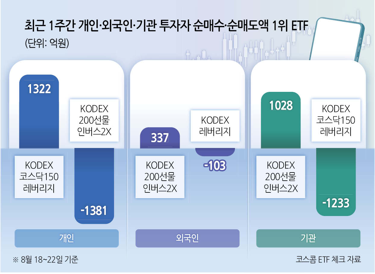 순매도액 1위와 3위로는 각각 코스닥150 지수와 코스피200 지수를 2배로 추종하는 ‘KODEX 코스닥150레버리지(1233억원)’, ‘KODEX 레버리지(527억원)’가 위치했다.