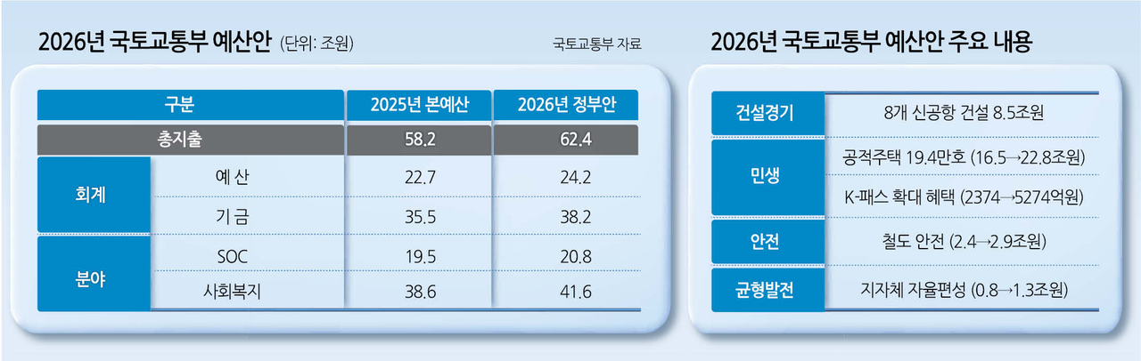 29일 국토부는 이같은 내용을 담은 2026년도 예산안을 공개했다. 내년도 국토부 예산은 올해 58조1760억원에 비해 4조2709억원(7.3%) 확대됐다. 이는 정부 전체 총지출(728조원)의 약 8.6%를 차지한다.