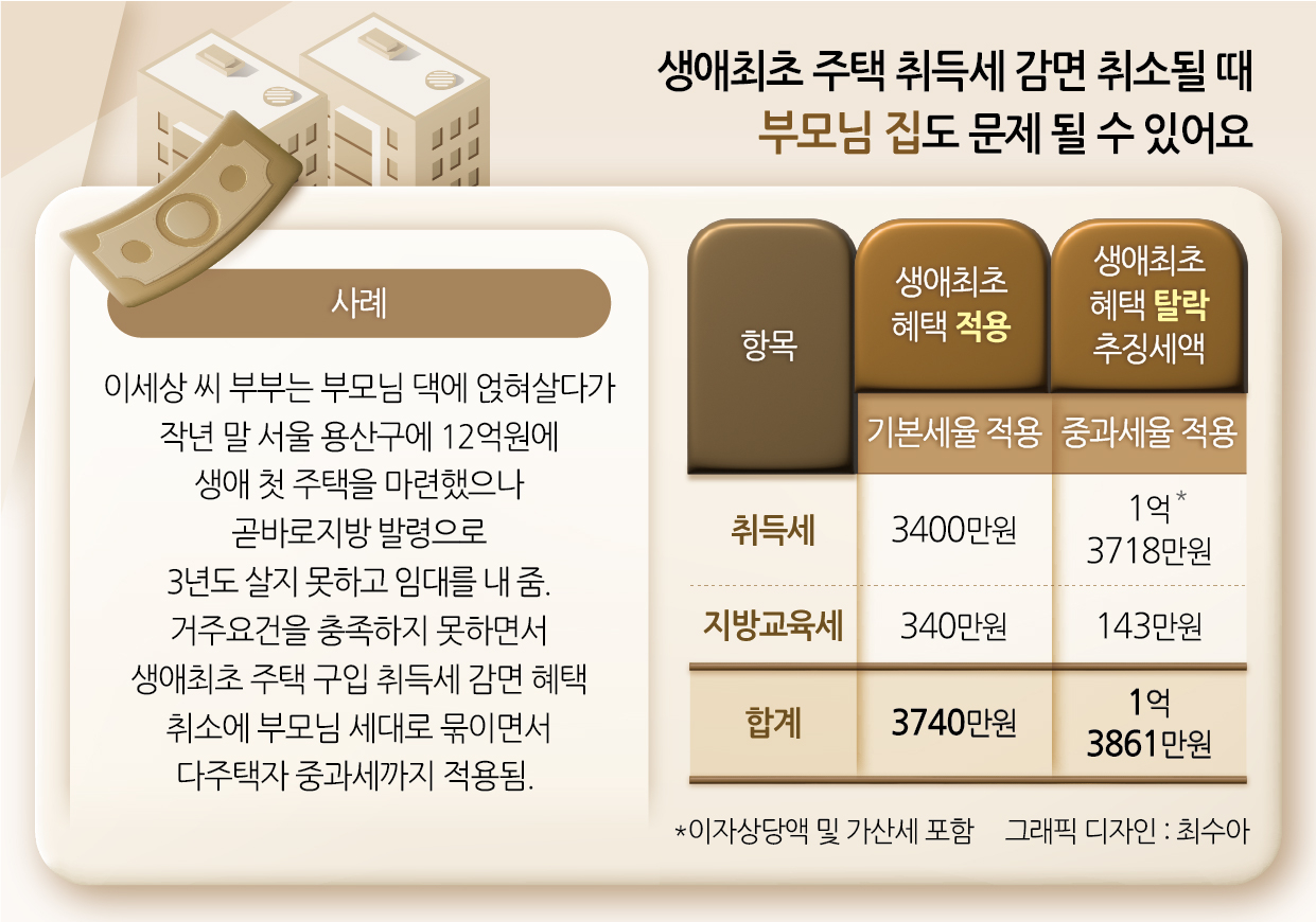 하지만 집을 살 당시에는 ‘생애최초 주택 구입자’ 요건을 갖추고 있었기 때문에 일시적으로 1주택 세대처럼 인정받아 기본세율로 세금을 낼 수 있었던 거죠.