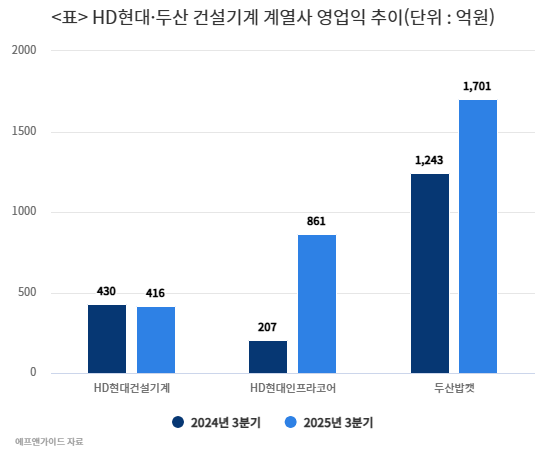 13일 금융정보제공업체 에프앤가이드에 따르면 HD현대인프라코어의 올해 3분기 영업이익 전망치는 861억원으로 지난해 같은 기간(207억원)보다 4배 이상 증가했다. HD현대의 또 다른 토토사이트 아띠 계열사인 HD현대토토사이트 아띠(416억원)는 지난해 3분기(430억원)와 유사한 수준의 영업이익을 기록할 것으로 예상된다. 두산밥캣의 3분기 영업이익 전망치는 1701억원으로 전년(1243억원) 동기 대비 36.9% 늘었다.