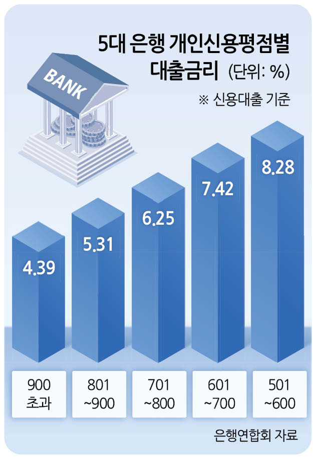 실제 은행연합회에 따르면 5대 은행의 개인신용평점별 신용대출 평균 롤 스포츠토토는 4.76%이지만 신용 평점이 낮을 수록 대출 롤 스포츠토토는 최대 8%대까지 올라간다. 900점을 초과하는 차주는 4.39%, 801~900점은 5.31%, 701~800점은 6.25% 등이다. 501-600점 차주의 평균 대출롤 스포츠토토는 8.28%다.