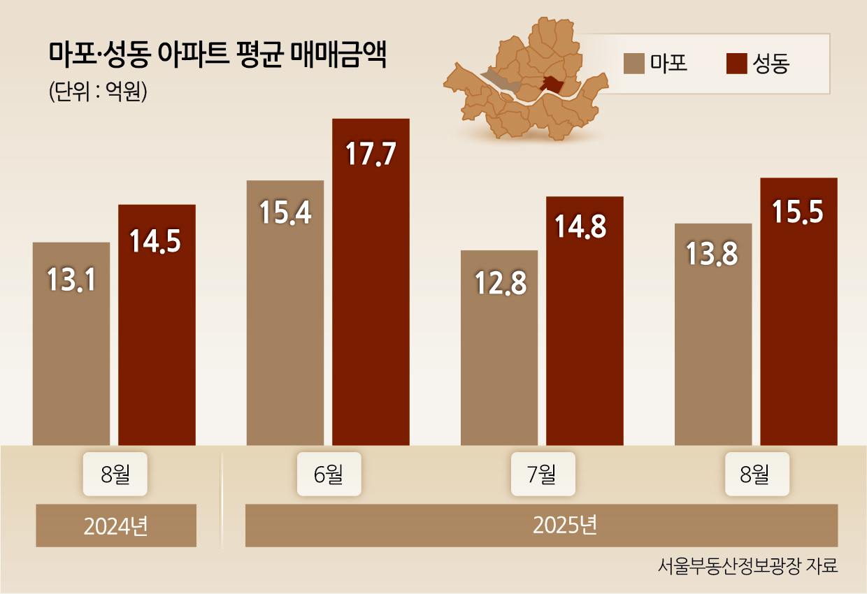 성동구 또한 6월 17억7487만원까지 올랐던 평균 아파트 매매가격이 7월 14억7851만원으로 떨어졌다가 지난달 15억5051만원으로 상승했다.