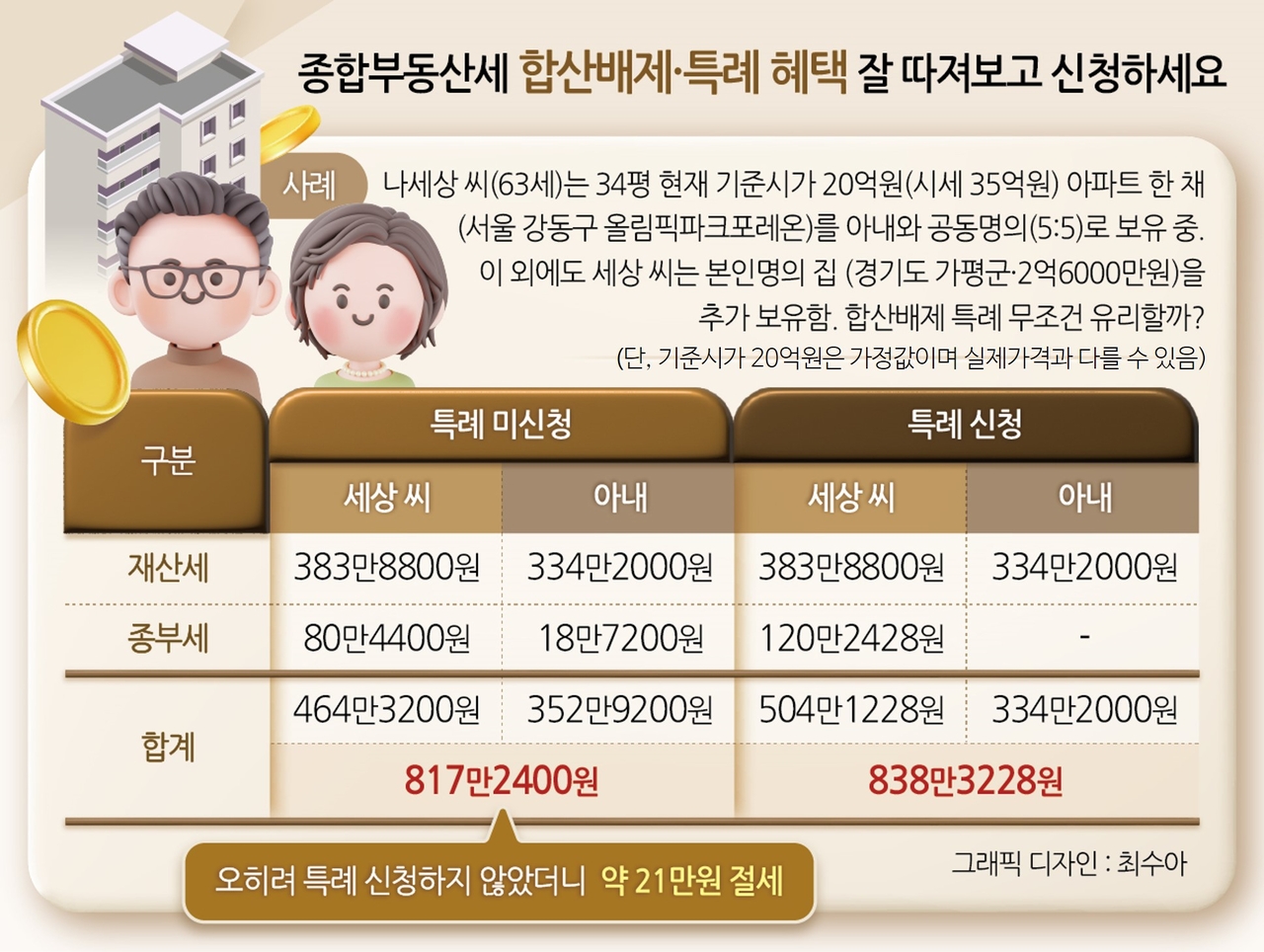 세상 씨가 바로 그 경우예요. 현재 아내와 공동명의로 아파트를 보유한 상태에서 특례를 신청하면 ‘대표 1인 12억원 토토사이트 대공원(+고령자·장기보유 토토사이트 대공원)’ 구조가 되고 특례를 신청하지 않으면 ‘부부 각 9억원, 합계 18억원 토토사이트 대공원’가 적용됩니다.