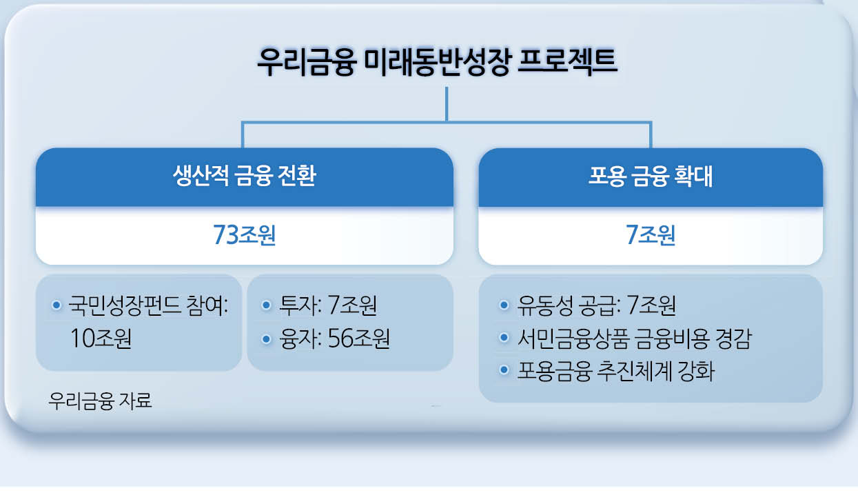 우리금융그룹이 29일 발표한 미래동반성장 프로젝트는 생산적·포용 금융이라는 금융 본연의 역할에 충실히 수행하겠다는 강력한 의지의 선언으로 풀이된다. 지난 5년간 투자 금액보다 두배 많은 규모를 투입하고 전체 대출에서 기업이 차지하는 비중도 60%로 도라에몽토토한다는 계획이다.