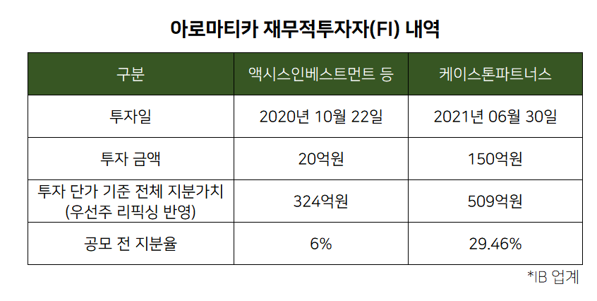공모 전 지분율은 케이스톤파트너스가 29.46%, 액시스인베스트먼트 등이 6%다. 리픽싱을 고려한 케이스톤파트너스의 아로마티카 캡스 토토사이트 밸류는 509억원, 액시스인베스트먼트는 324억원으로 추정된다.