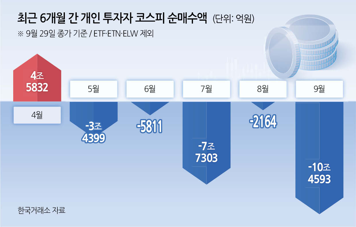 한국거래소에 따르면 29일 종가 기준으로 9월 들어서만 개인 투자자는 토토사이트 콬에서 10조4593억원 규모의 순매도세를 기록했다. 개인 투자자의 월간 순매도액이 사상 최초로 10조원 선을 넘어선 것으로, 기존 월별 개인 최대 순매도액 8조4120억원(2024년 2월) 기록 경신도 확실시된다.