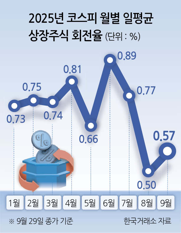 1일 한국거래소에 따르면 지난 9월 29일 종가 기준으로 9월 일평균 상장주식 회전율은 0.57%를 기록했다. 지난달(0.5%)에 이어 올해 두 번째로 낮은 수준이다. 특히 9월은 토토사이트 콬가 연일 ‘역대 최고점’을 경신하면서 역대급 강세장이 펼쳐진 가운데도 증시 활력 수준을 보여주는 회전율이 좀처럼 회복되지 못했다.