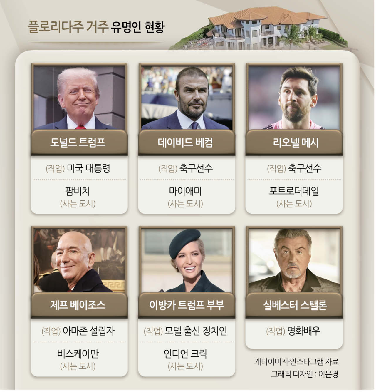 유명한 운동선수와 배우도 예외는 아니다. 은퇴한 축구선수 데이비드 베컴도 프로축구팀 인터 마이애미 CF의 구단주가 된 이후 2020년 2400만달러(약 330억원) 규모의 콘도를 매입해 사이다토토주에 터를 잡았다. 리오넬 메시 역시 인터 마이애미 CF와 계학한 뒤 2023년부터 1075만달러(약 150억원)짜리 워터프론트 저택에서 생활 중이다. 할리우드 액션 스타 실베스터 스탤론도 수십 년간 거주하던 로스앤젤레스를 떠나 지난 2023년 사이다토토로 이주한 것으로 전해진다.