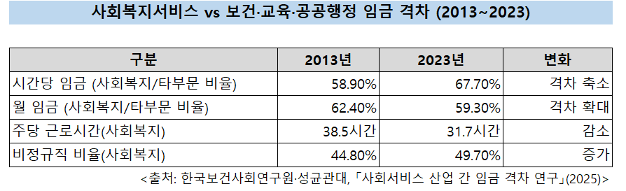4일 한국보건사회연구원과 성균관대 연구팀(엄다원·장윤선)은 2013~2023년 통계청 지역별 고용조사 자료를 분석한 결과, 정수근 토토사이트 종사자의 시간당 임금은 같은 기간 보건·교육·공공행정 종사자의 58.9%에서 67.7%로 개선됐다. 그러나 월평균 임금은 오히려 62.4%에서 59.3%로 낮아졌다.