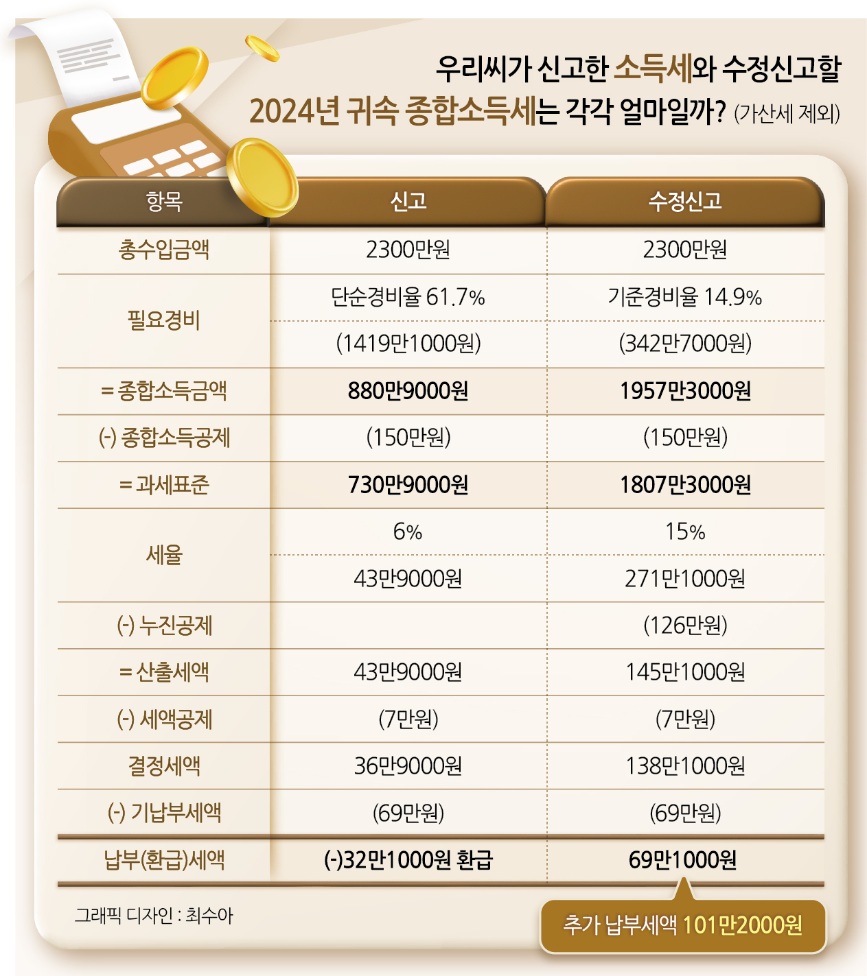 그런데 최근 관할 세무서에서 “종합소득세 신고가 잘못됐다”며 수정신고 안내를 받았다. 심지어 수정신고를 하면 올해 환급받은 30만원을 돌려내야 할 뿐 아니라 70만원가량을 추가로 내야 해, 결과적으로 약 100만원을 내야 한다는 사실을 듣고 깜짝 놀랐다.