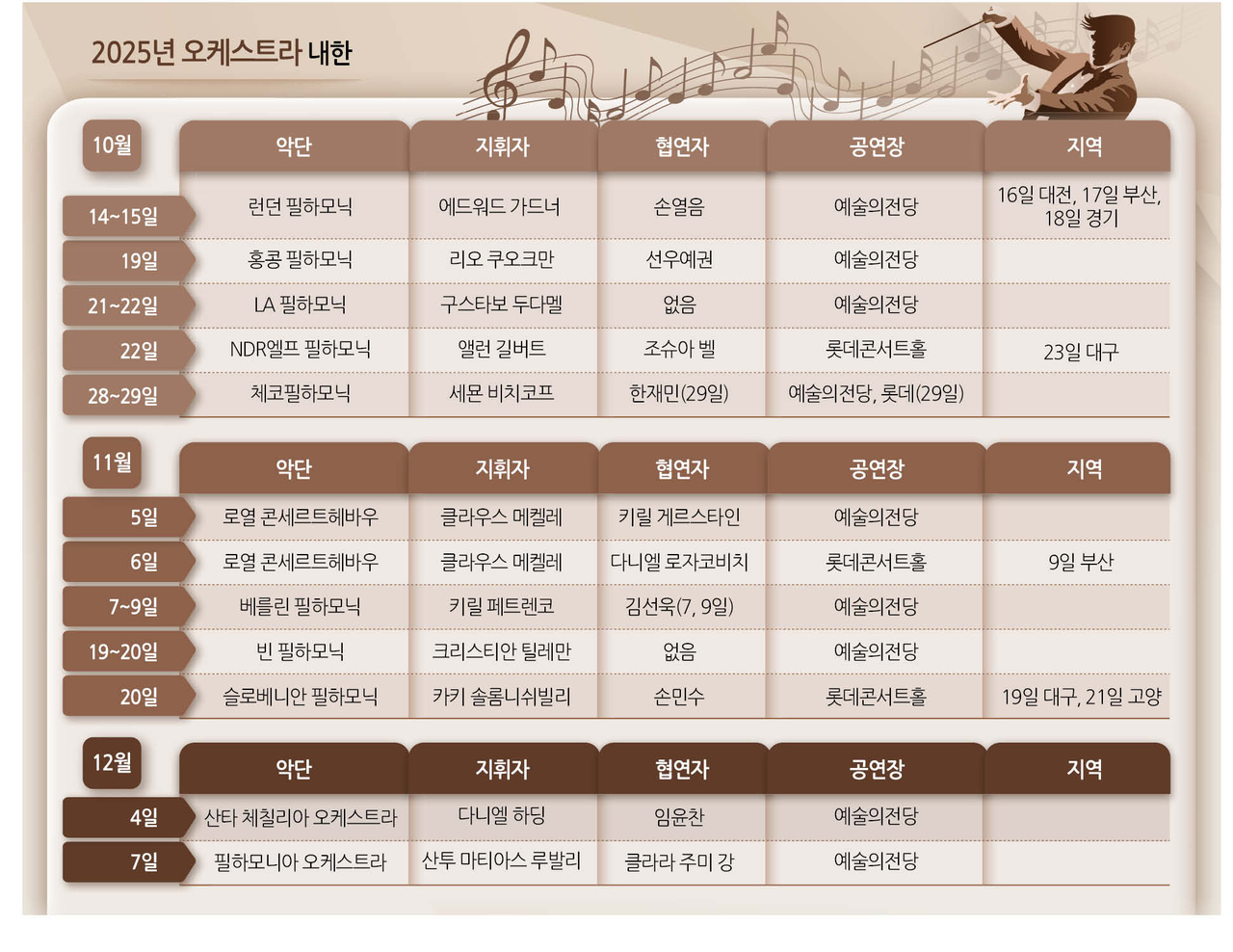 명실상부 세계 클래식 음악계 ‘최강의 조합’으로 꼽히는 빈필하모닉과 지휘자 크리스티안 틸레만(드레스덴 슈타츠카펠레)도 한국에 온다. 빈필은 지휘자가 없는 ‘자치 체제’로 운영하다 상황에 맞게 지휘자를 초청한다. 이번 공연에서 빈필의 선택을 받은 지휘자가 바로 틸레만인 것이다. 국내에서 펼쳐질 두 번의 공연에선 슈만의 교향곡 3번 ‘라인’, 브람스 교향곡 4번(11월 19일, 예술의전당)과 브루크너 교향곡 5번(11월 20일, 예술의전당) 등을 들을 수 있다.