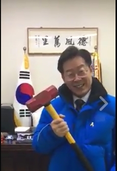 [헤럴드경제]대선 출마를 선언한 스포츠토토사이트 성남시장이 27일 자신의 페이스북에 한 지지자로부터 선물받은 쇠망치를 들고 있는 영상을 올리며 부패 기득권 청산을 위한 의지를 다졌다.