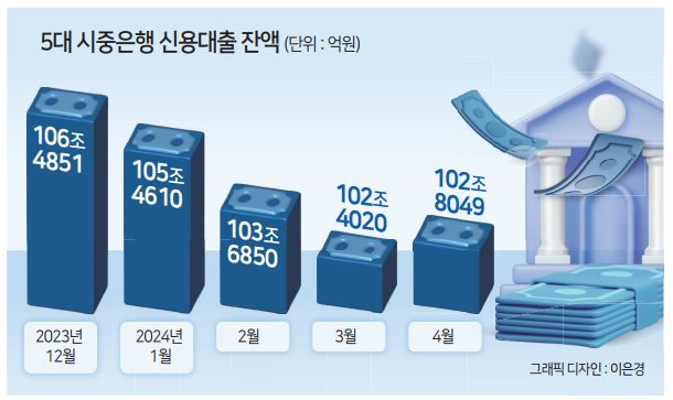신용대출 잔액은 그간 장기화되는 고금리로 인해 계속 감소세를 유지해왔다. 지난해 12월 5대 은행 신용대출 잔액은 106조4851억원이었지만 ▷1월 105조4611억원 ▷2월 103조6851억원 ▷3월 102조4021억원으로 쭉 감소했다. 그러다 4월 다시 반등세를 보인 것이다.